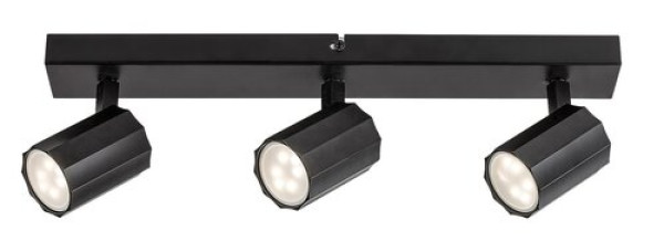 Moderna Rogelio plafonska lampa sa 3 sijalice može biti praktičan izbor u dnevnoj sobi, spavaćoj ili radnoj sobi. Mat crni metalni element upotpunjen je cilindričnim aluminijumskim abažurima iste boje, a lampa se može pričvrstiti na plafon uz pomoć dugačkog pravougaonog ukrasnog postolja. Zahvaljujući fleksibilnim glavama lampe, svetlost lampe može da se usmerava po želji, čime se omogućava efikasno osvetljenje prostorije. Rogelio se može koristiti sa tri sijalice, svaka snage do 5 V. Tip grla je GU10. Ukoliko želite da lampu postavite u dnevnu ili radnu sobu, preporučljivo je da je koristite sa sijalicama koje emituju prirodnu belu svetlost jer vam to pomaže da postignete moderan, čist efekat i doprinosi efikasnom radu. Dimenzije plafonske svetiljke Rogelio sa 3 sijalice su sledeće: širina 430 mm, prečnik svakog abažura 50 mm, rastojanje lampe od plafona 125 mm. Ovaj model se isporučuje bez izvora svetlosti.